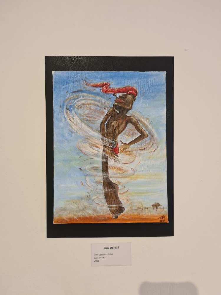 Tela da ilustração da carta: saci-pererê. Exposição período junho/julho2024 na galeria do SESC 504 Sul - Brasília DF.