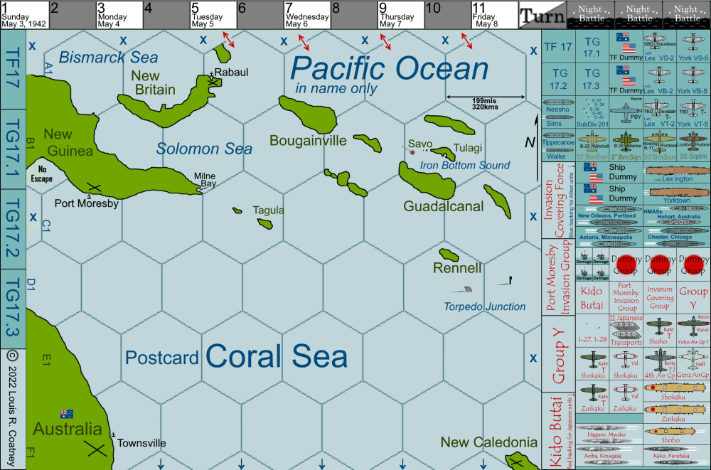Regra de desembarque puro de Port Moresby: número de transportes japoneses sobreviventes (de 11) mais unidades de cruzadores japoneses de bombardeio costeiro não danificados jogam 2 dados para ver se eles aceitam. A batalha pode continuar no próximo turno do jogo.