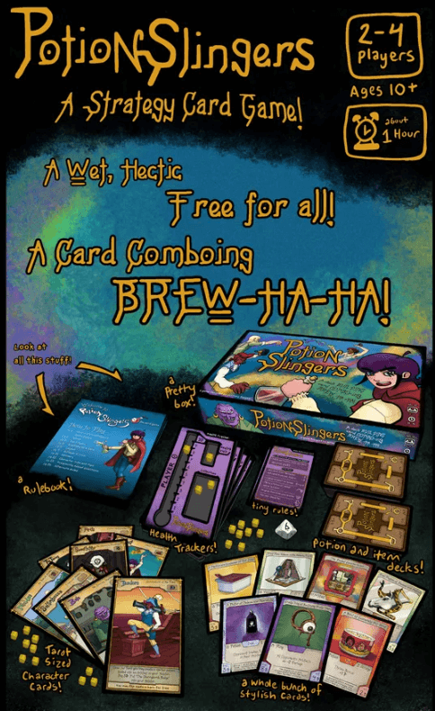 Um jogo de cartas de estratégia! Um molhado e agitado grátis para todos! Uma combinação de cartas BREW-HA-HA! PotionSlingers pode ser descrito como um delicioso bolo de combate. É revestido com uma cobertura colorida de humor pastelão vibrante, com um verniz de alquimia antiga.