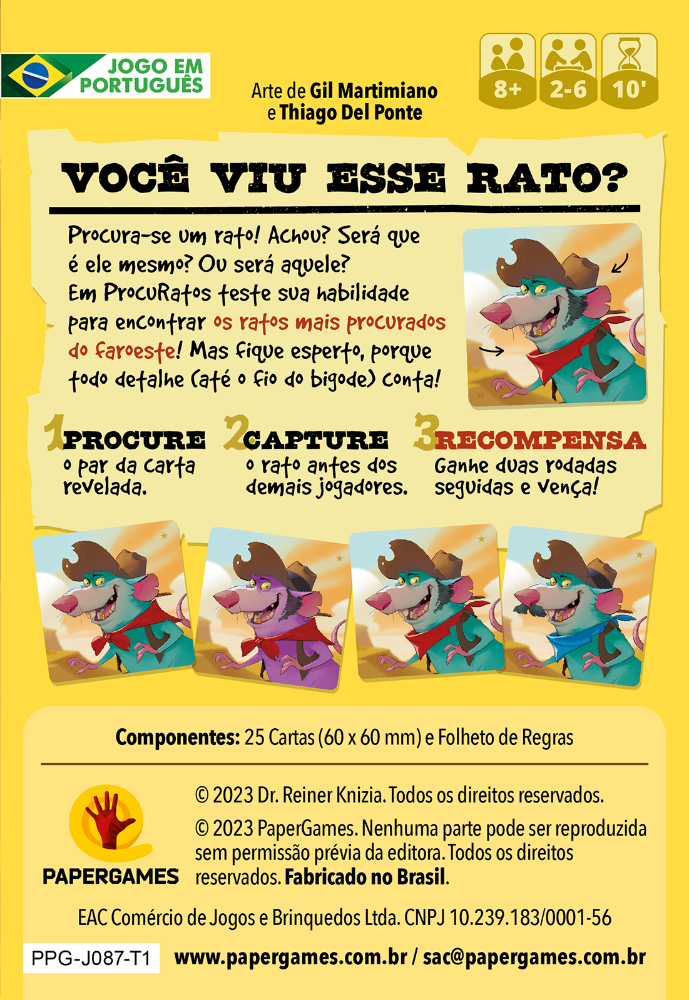 - RÁPIDO DE JOGAR! FÁCIL DE EXPLICAR! Com regras simples e partidas de 10 minutos, ProcuRatos é um jogo para todas as ocasiões!