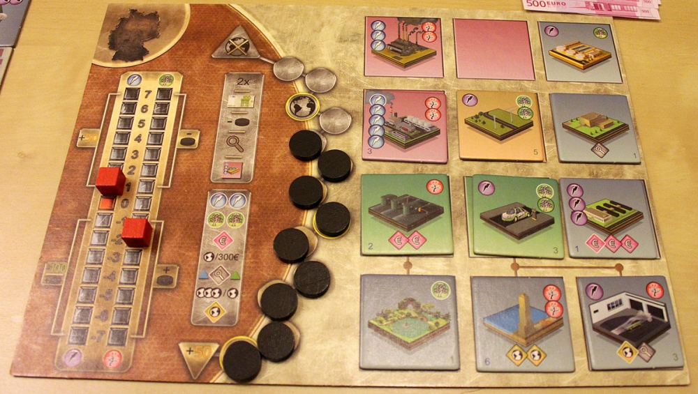 O jogo começa com 24 peças disponíveis, metade do lado da energia do tabuleiro de jogo e metade do lado da ecologia. Duas peças de cada lado são colocadas em níveis 1-6, com cada jogador possuindo dois marcadores de pesquisa - de energia e ecologia - que começam no nível 1. Cada jogador tem um tabuleiro individual com espaços codificados por cores, uma trilha de poluição, e faixas de energia e ecologia. Uma pilha de 36 peças - com placas organizadas por décadas: seis a partir de 2030 na parte inferior, então cinco a partir de 2020, e assim por diante até cinco de 1970 - é criada na área de jogo.
