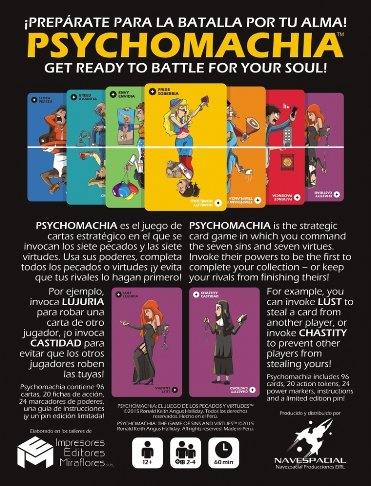 Psychomachia é um jogo de cartas estratégico no qual você junta e invoca os sete pecados mortais e as sete virtudes celestiais. Para ganhar, tem que colocar os sete pecados no inferno ou as sete virtudes no céu, usando ações pecaminosas e virtuosas.