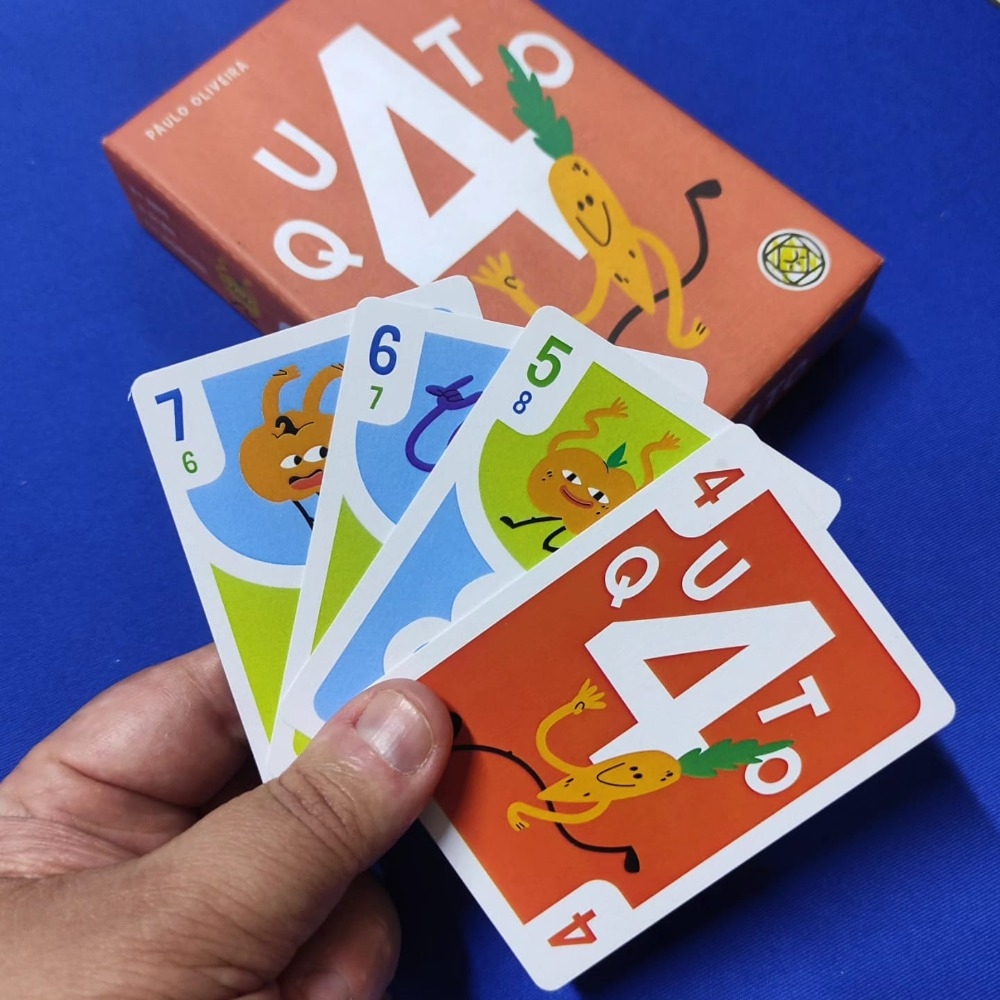 QU4TO é um jogo de cartas dinâmico e divertido, onde jogadores tentam descartar o mais rapidamente suas mãos, jogando conjuntos de cartas de números iguais ou sequências. A decisão de jogar um conjunto mais forte ou passar o turno é crítica: passar permite girar uma carta para alterar seu valor ou comprar uma nova do baralho, aumentando ainda mais suas possibilidades estratégicas.