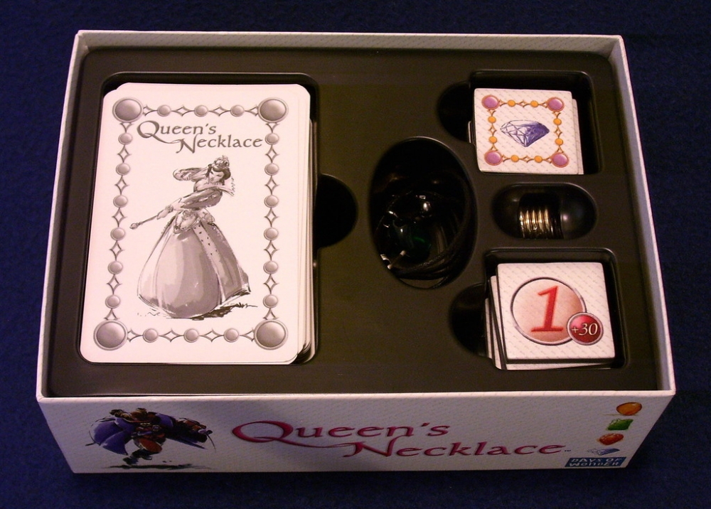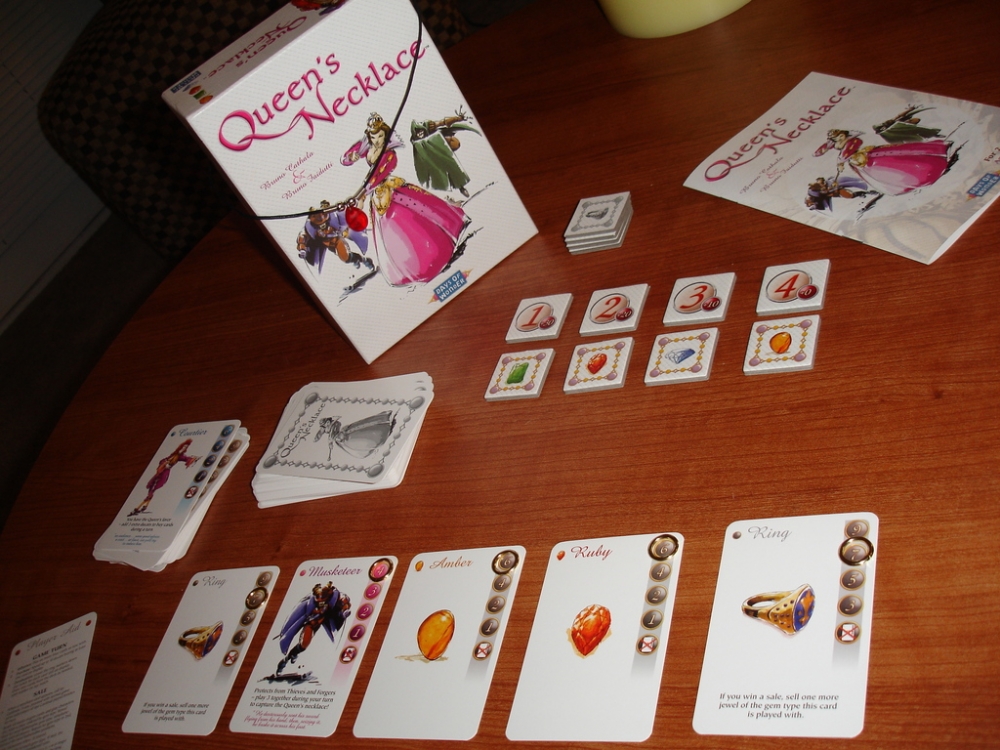 Ambientado em Paris, durante o ápice da revolução francesa, Queen's Necklace é um jogo de venda de pedras preciosas, influência e intriga na corte. Dois a quatro jogadores competem pelo papel de joalheiro real para vender gemas raras para a rainha e toda sua corte.