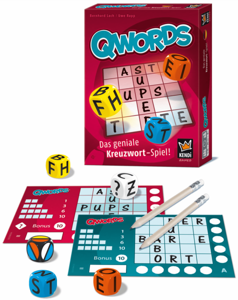 O jogo de palavras Qwords, lançado inicialmente como Kreuzwort, apresenta quatro dados de letras em cores diferentes e um dado preto que exibe uma combinação de duas cores em cada lado.