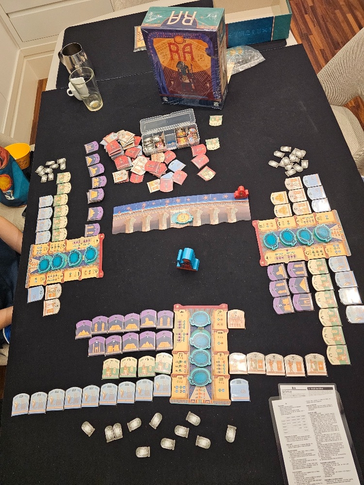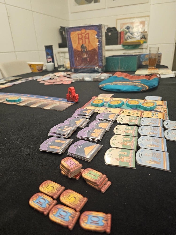 Ra é um jogo de leilão e coleção de componentes com um egípcio antigo no tema. A cada turno, os jogadores podem comprar muitas peças com suas peças de lance (sóis). Uma vez que um jogador tenha usado seus sóis, os outros jogadores continuam até que façam o mesmo, o que pode criar uma situação com um único jogador incontestado apostando em peças antes do final da rodada. A tensão aumenta porque a rodada pode terminar antes que todos os jogadores tenham a chance de ganhar seus três lotes para a época. As várias peças ou dão pontos imediatos, evitam pontos negativos por não ter certos tipos no final da rodada (época), ou dão pontos após a rodada final. O jogo dura três "épocas" (rodadas). O jogo oferece uma curva de aprendizado curta, e os jogadores experientes o consideram rápido.
