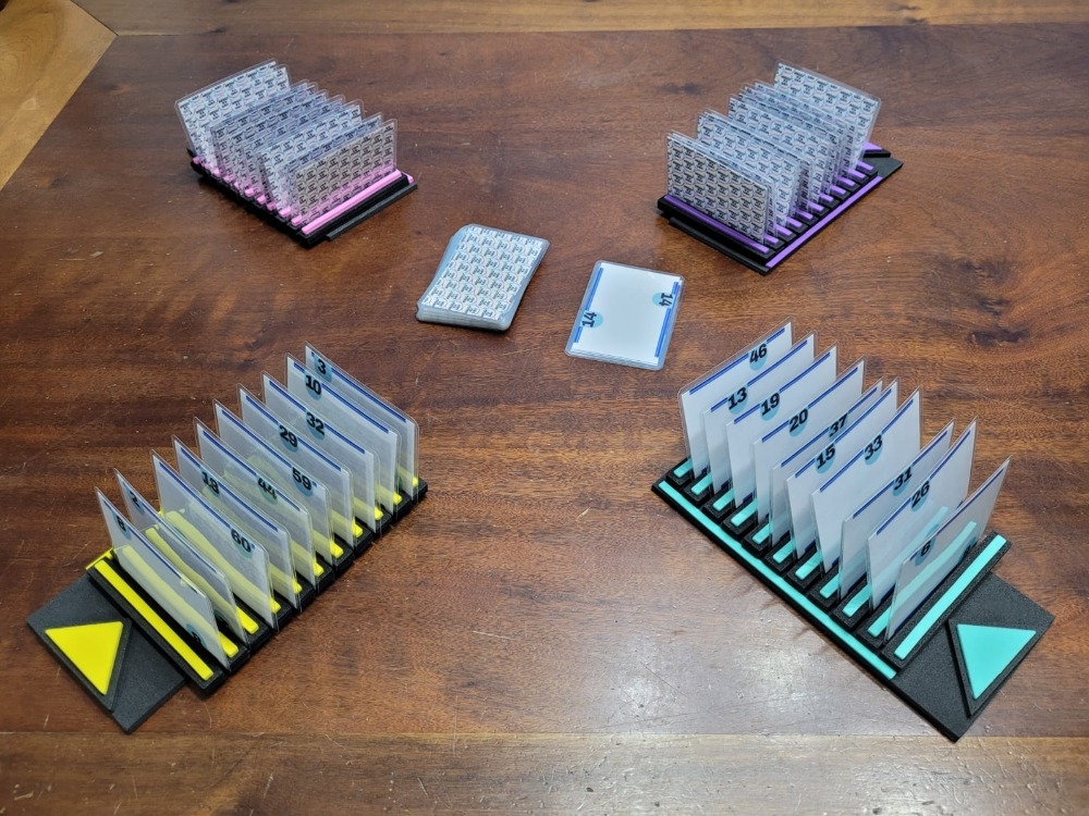 60 cartas numeradas, 4 racks suportes plásticos para encaixar as cartas na ordem de compra.