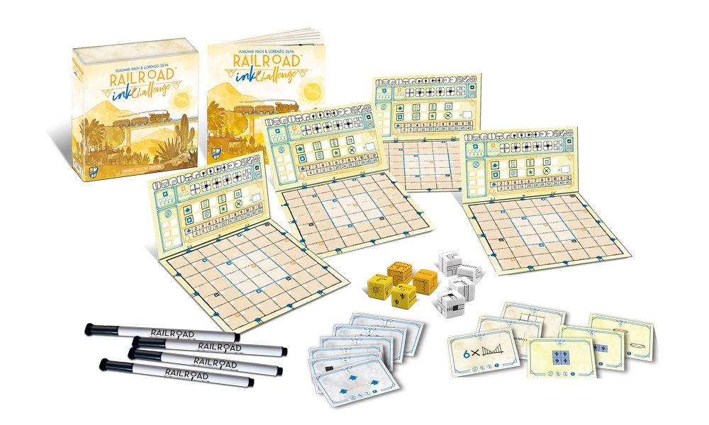 Railroad Ink Challenge vem em duas versões, cada uma incluindo uma expansão com um conjunto de dados adicional que adiciona novas regras especiais aos seus jogos. Na Edição Shining Yellow , jogue os dados especiais de cactos e use oásis para proteger seus cactos do clima árido do deserto, ou construa o cânion mais longo possível com a expansão do Cânion, mas tome cuidado para não afundar no chão!