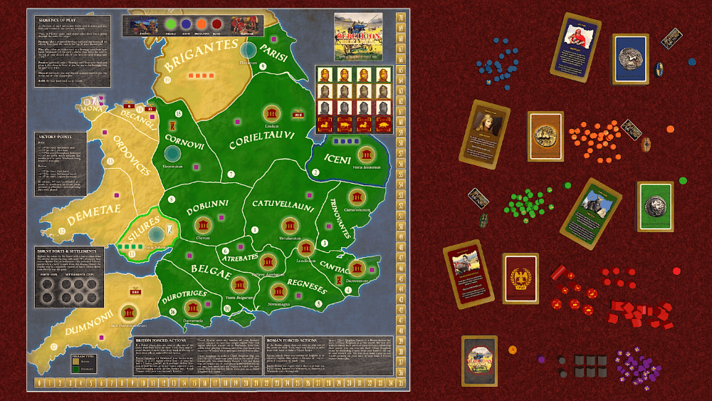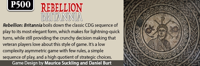 Rebellion: Britannia é um jogo sobre as campanhas militares romanas para suprimir as rebeliões dos Silures, Brigantes e Boudica (47-61 EC) e as relações entre as principais tribos britânicas.