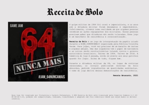 Receita de Bolo é um jogo de interpretação de papéis criado durante a #JAM_64NUNCAMAIS organizada pela Editora Coisinha Verde. Para jogá-lo, é necessário apenas um baralho de cartas. Esse jogo é um manifesto de resistência e conscientização contra a ditadura militar de 64 e seus filhotes.