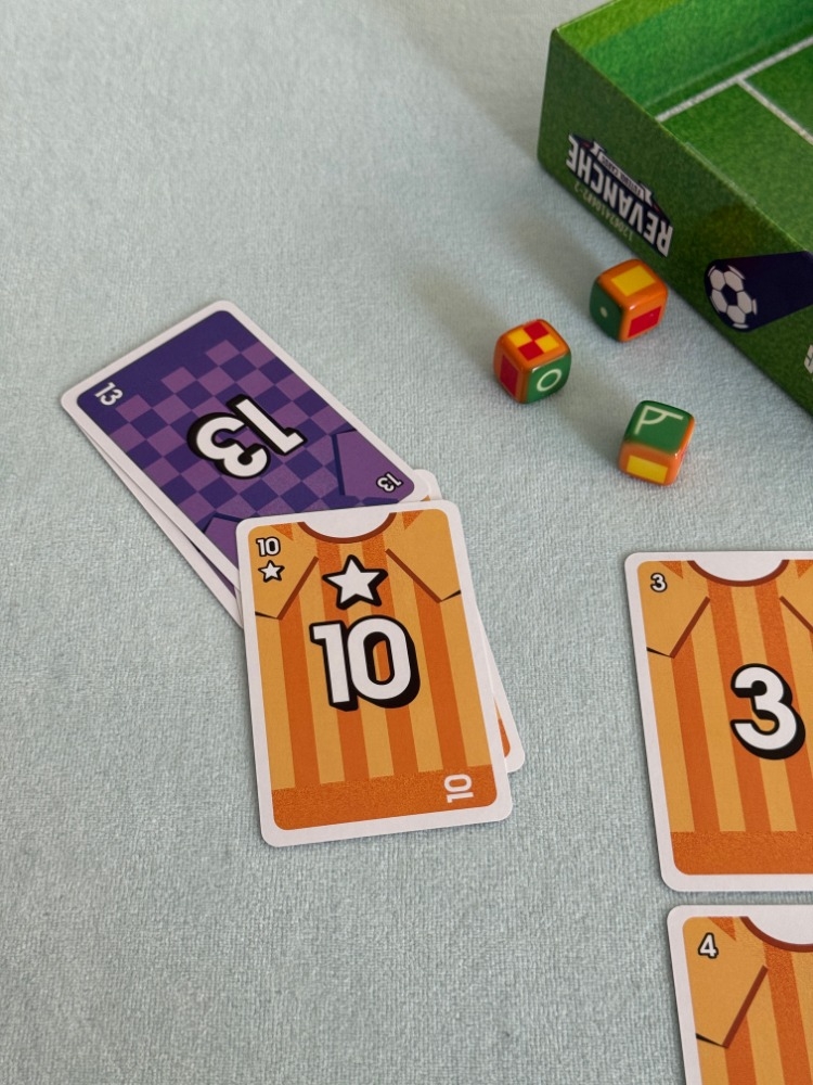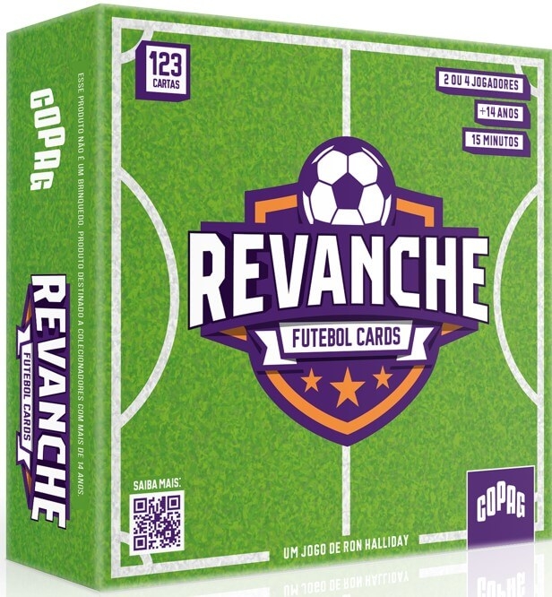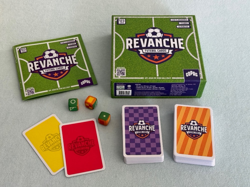 Revanche é um jogo de cartas com tema de futebol no qual jogadores tomam posse da bola e geram oportunidades de gol ao jogar cartas de mesmo número. O dado de árbitro oferece chutes diretos, escanteios e pênaltis, mas também cartões amarelos e vermelhos! O jogo também incorpora aspectos como substituição, acréscimos, prorrogação e disputa de pênaltis. O jogador que fizer mais gols vence!