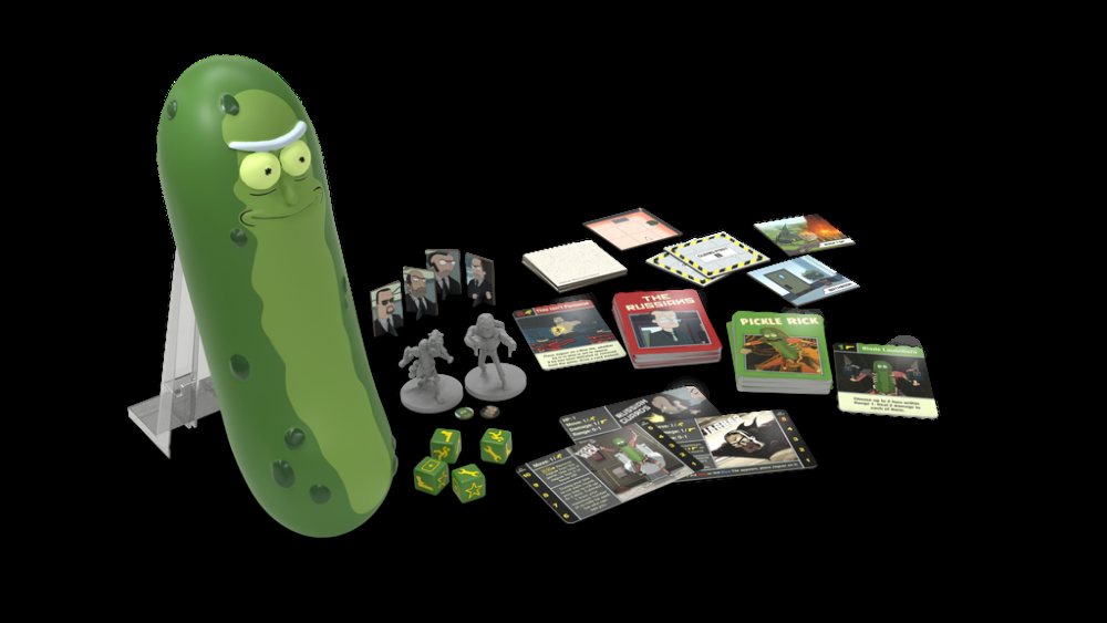 Como você pode esperar, Rick e Morty: The Pickle Rick Game é baseado no episódio "Pickle Rick" de Rick e Morty, do Adult Swim. Um jogador joga como Pickle Rick enquanto tenta escapar de um complexo fortemente armado, enquanto o outro jogador assume os papéis tanto dos russos quanto da Jaguar enquanto tentam pará-lo. O jogador Pickle Rick usa cartas de armas para distribuir dano e aberturas de ar para escapar dos doces enquanto tentam chegar ao telhado. O jogo inclui miniaturas de Pickle Rick e Jaguar que são movidas através de um tabuleiro dinâmico composto de peças que são constantemente adicionadas, giradas e invertidas.