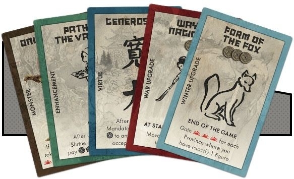 96 minicartões de clã e província exclusivos do Kickstarter para serem usados com os 3 modos de jogo especiais que mudam as regras da guerra. Originalmente, esses modos de jogo exigiam que os jogadores escrevessem em um pedaço de papel a Província ou Clã escolhido, mas esta promoção dará a cada jogador um conjunto completo de 8 cartas de Província e 8 cartas de Clã para escolher. Incluído na edição Kickstarter da história em quadrinhos Rising Sun de 68 páginas, uma edição exclusiva das 3 edições do Rising Sun publicadas pela IDW.