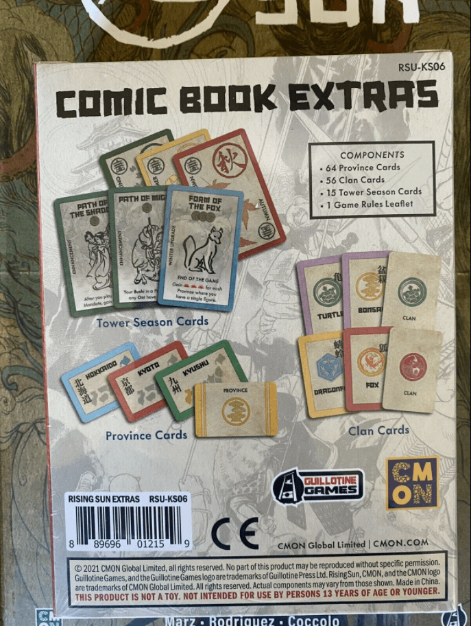 96 mini cartas de Clãs e Províncias exclusivos do Kickstarter da graphic novel de 68 páginas do Sol Nascente, uma edição exclusiva das 3 edições do Sol Nascente publicada pela IDW, para serem usados com os 3 modos de jogo especiais que mudam as regras da guerra. Originalmente, esses modos de jogo exigiam que os jogadores escrevessem em um pedaço de papel de sua província ou clã escolhido, mas esta promoção dará a cada jogador um conjunto completo de 8 cartas da Província e 8 cartas do Clã que eles podem escolher.