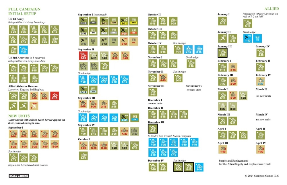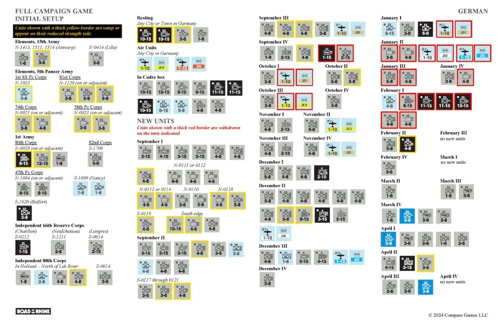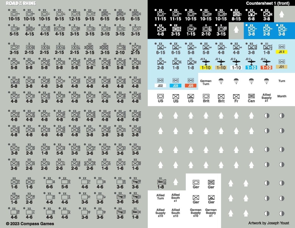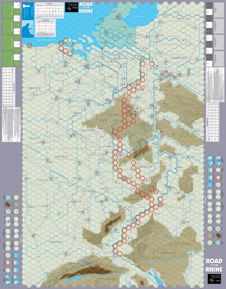 Road to the Rhine é outro clássico da Game Designers' Workshop, remasterizado pela Compass Games. Originalmente projetada por Frank Chadwick, esta edição presta homenagem ao clássico honrando o sistema de jogo original enquanto introduz muitas melhorias para propósitos de jogabilidade. Em termos de apresentação, nós atualizamos todos os componentes, incluindo mapas completamente novos e coloridos, novos reforços e novas exibições de unidades, trilhas de turno e suprimentos expandidas, gráficos aprimorados, um livro de regras com errata incorporada e contadores maiores.