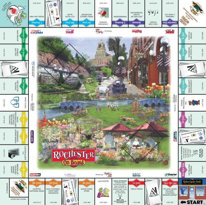 Rochester On Board é um clone do Banco Imobiliário baseado na cidade de Minnesota. Os quadrados do tabuleiro são substituídos por marcos e empresas da área. Os rendimentos do jogo vão beneficiar a Women's Shelter Inc.