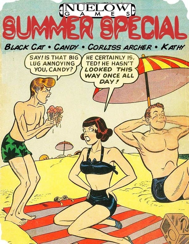 O Especial de Verão NUELOW celebra a chegada do verão com uma coleção de clássicos da comédia adolescente da Era de Ouro dos Quadrinhos! Vá à praia com o estúpido Corliss Archer, a excessivamente prestativa Candy, a bela Suzie, que toma sol, e a extremamente ciumenta Kathy. E então você pode atacar os bandidos com Black Cat, enquanto o super-herói mascote de NUELOW pratica esqui aquático!