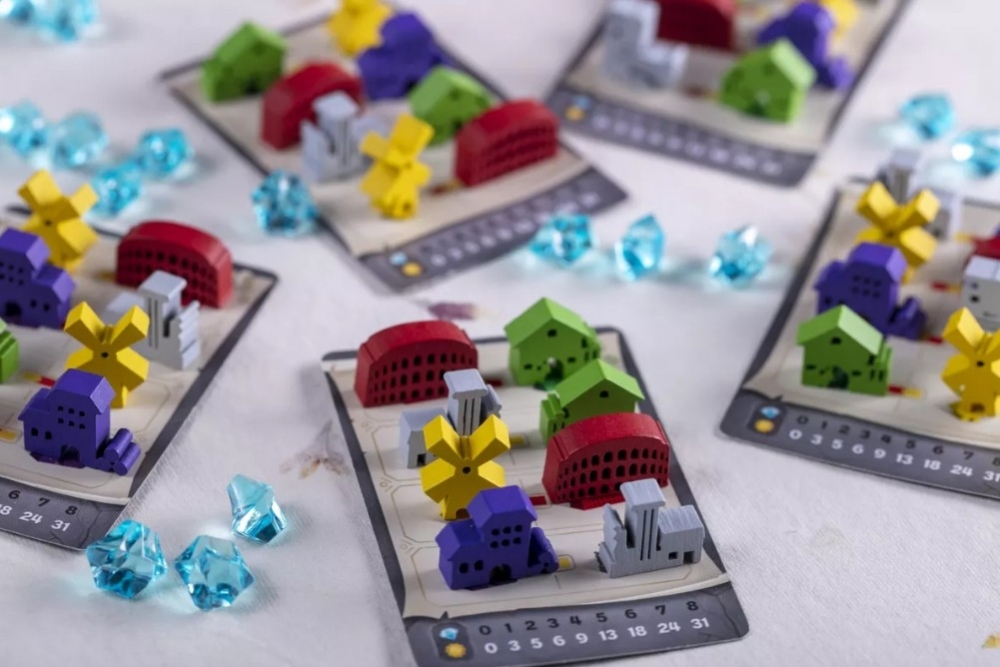 Antes do início, todos os jogadores recebem seu conjunto pessoal de edifícios com a carta de edifícios, uma pilha de peças de terrenos (existem 5 tipos - campos, cidade, olivais, etc.), gemas/cristais, cartas de escolha de menores e maiores terrenos, cartões de lembrete e telas.