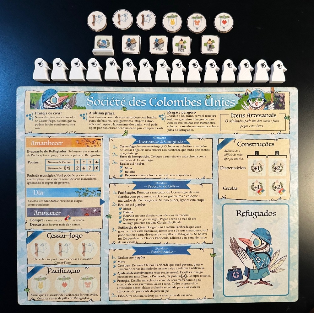 Fan Faction Société des Colombes Unies, em Português, com os meeples em impressão 3D.