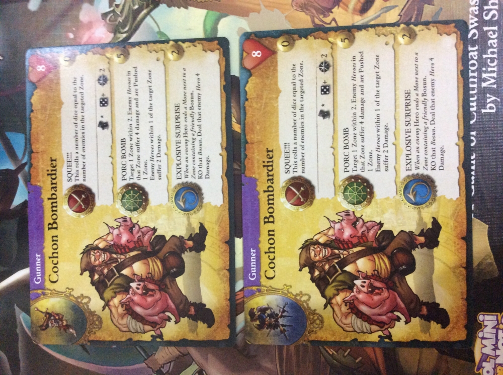 Cochon vem com duas versões de cartas de herói. Ele pode ser jogado tanto como um mercenário ou como parte da tripulação de La Brise Sanguine.