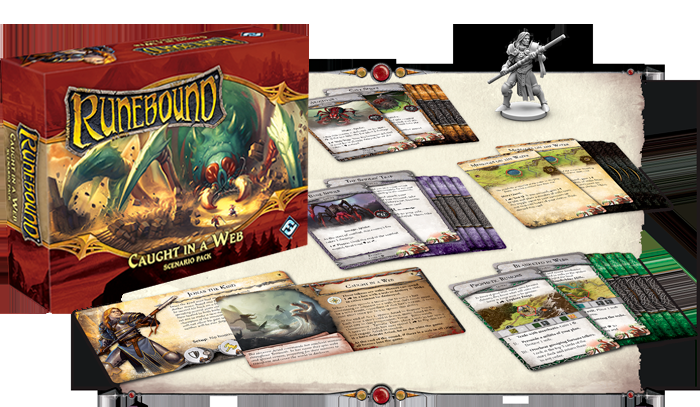 Como mencionado acima, Caught in a Web é um pacote de cenário que apresenta um cenário inteiramente novo para Runebound. Durante todo o curso deste cenário, cartas de história e cartas de aventura farão com que teias sejam colocadas através do mapa. Essas teias restringem o movimento dos heróis, mas elas podem ser destruídas se você estiver disposto a gastar o esforço. No final do primeiro ato, a feiticeira Ariad transforma-se em sua forma de aranha e começa a se mover em torno do reino. Se ela colocar uma teia em cada uma das quatro grandes cidades, todos os heróis perdem o jogo. A única maneira para ganhar é rastrear Ariad e derrotá-la na batalha antes que outro herói possa alcançá-la!
