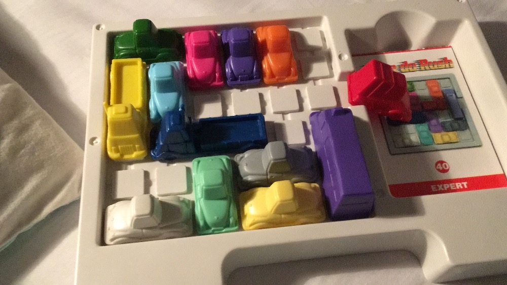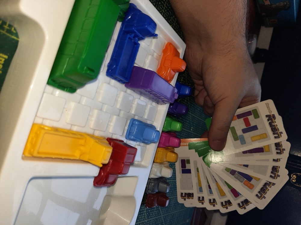 Hora do Rush é um jogo de estratégia que vai fazer você quebrar a cabeça! O seu carro é o vermelho e você só tem uma saída. Possui 40 cartas desafios divididas em 4 níveis (iniciante a expert). Coloque os carrinhos na posição em que estão na carta desafio e movendo os outros carros tente escapar desse trânsito maluco.