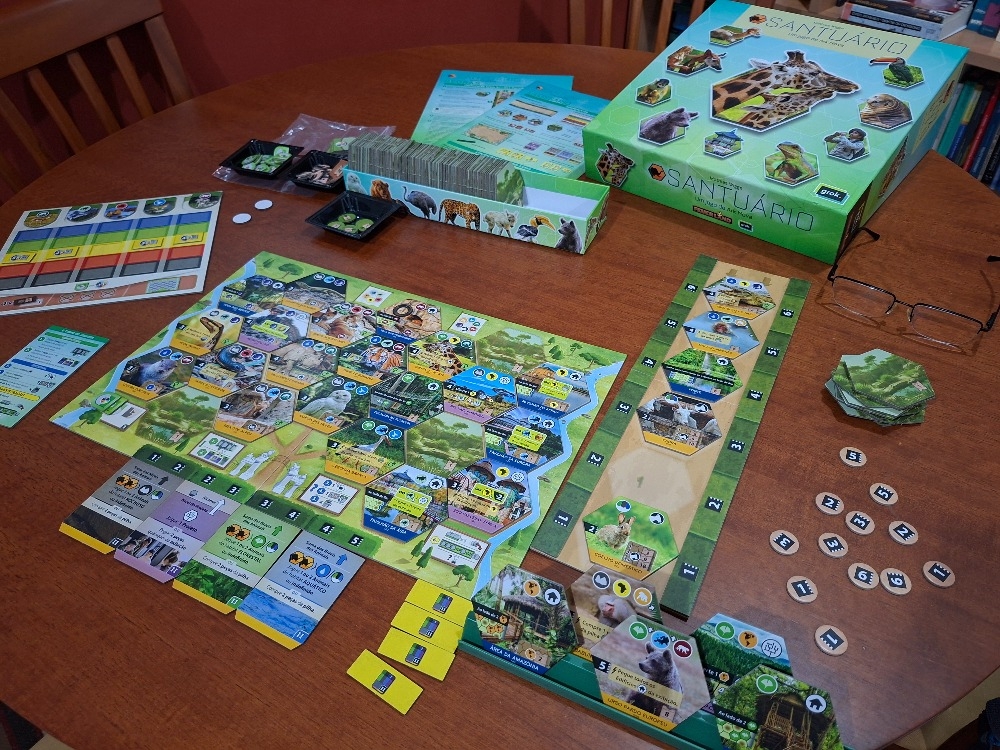 Sanctuary é baseado em seu predecessor Ark Nova, mas modifica e simplifica muitos dos mecanismos daquele jogo de uma maneira elegante e surpreendente. Seu objetivo de encontrar a melhor maneira de juntar seus animais, edifícios e projetos no mapa do seu zoológico é um prazer contínuo!