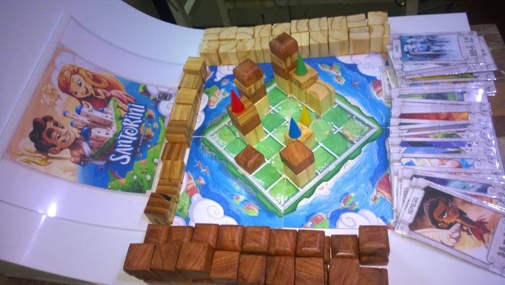 PnP home made do Santorini com peças em madeira de construção reaproveitada. Variações de altura e cores dos andares e domo para facilitar identificação pelos jogadores. Cartas impressas em sulfite A4 e coladas, tanto frente quanto verso em papel Canson.