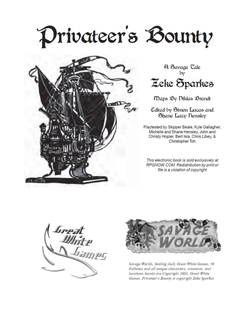 Olá, amigo! Suba na linha principal e prepare-se para uma aventura furiosa na era da vela usando os Savage Worlds da Pinnacle! Inscreva-se como tripulação a bordo do Grey Coarser, um navio corsário inglês, e infernize os navios franceses e espanhóis enquanto enche seus bolsos com ouro. Intensas batalhas de canhão, lutas de espadas no alto do cordame, baús de tesouro; a vida do corsário tem tudo! Levante a âncora e veja que aventura o espera em mar aberto.