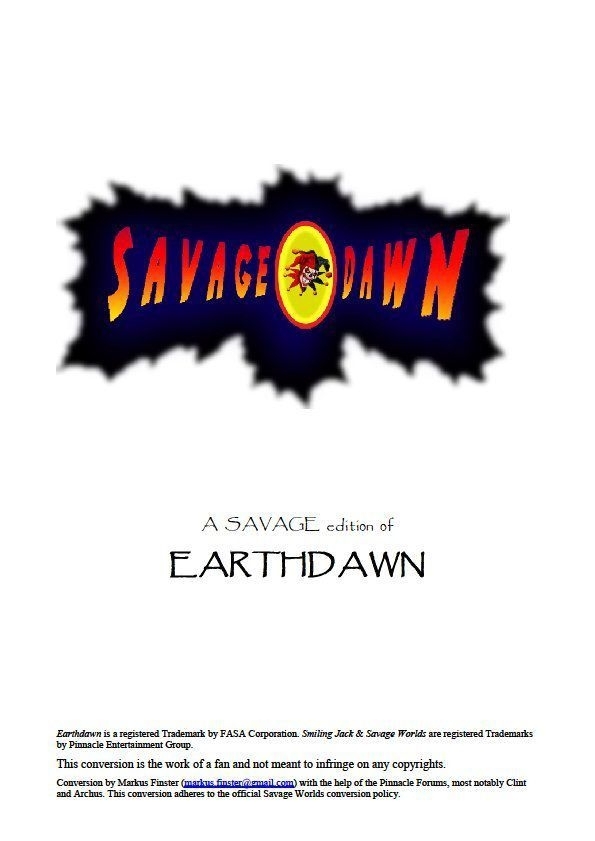 Este pequeno documento é tudo que você precisa para jogar Earthdawn com as regras do Savage Worlds. Nas páginas seguintes você encontrará regras para as corridas, para as diversas disciplinas, como a magia funciona sem Power Points e assim por diante. Este é um trabalho em andamento e embora praticamente todos os princípios básicos sejam abordados, o feedback dos playtests pode alterar drasticamente o conteúdo deste arquivo.