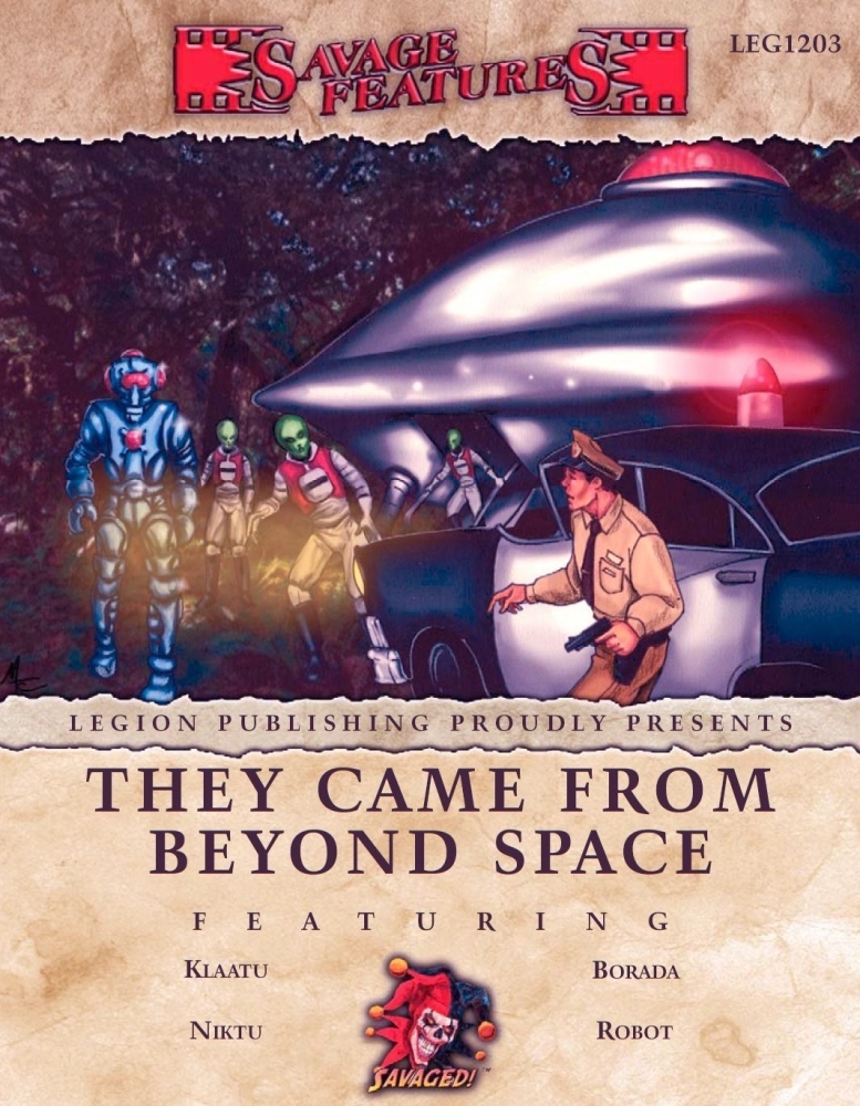 Bem-vindo ao nosso recurso principal! Este é o terceiro da série Savage Features da Legion Publishing e inclui tudo que você precisa para rodar um jogo Savage Worlds baseado nos filmes B da década de 1950. Só que este filme tem uma reviravolta – os heróis são os invasores alienígenas! Será que os terráqueos perceberão que vieram em paz? Será que os visitantes? tecnologia superior surpreende ou assusta? Eles terão sucesso em sua missão? O destino do mundo está em suas mãozinhas verdes!