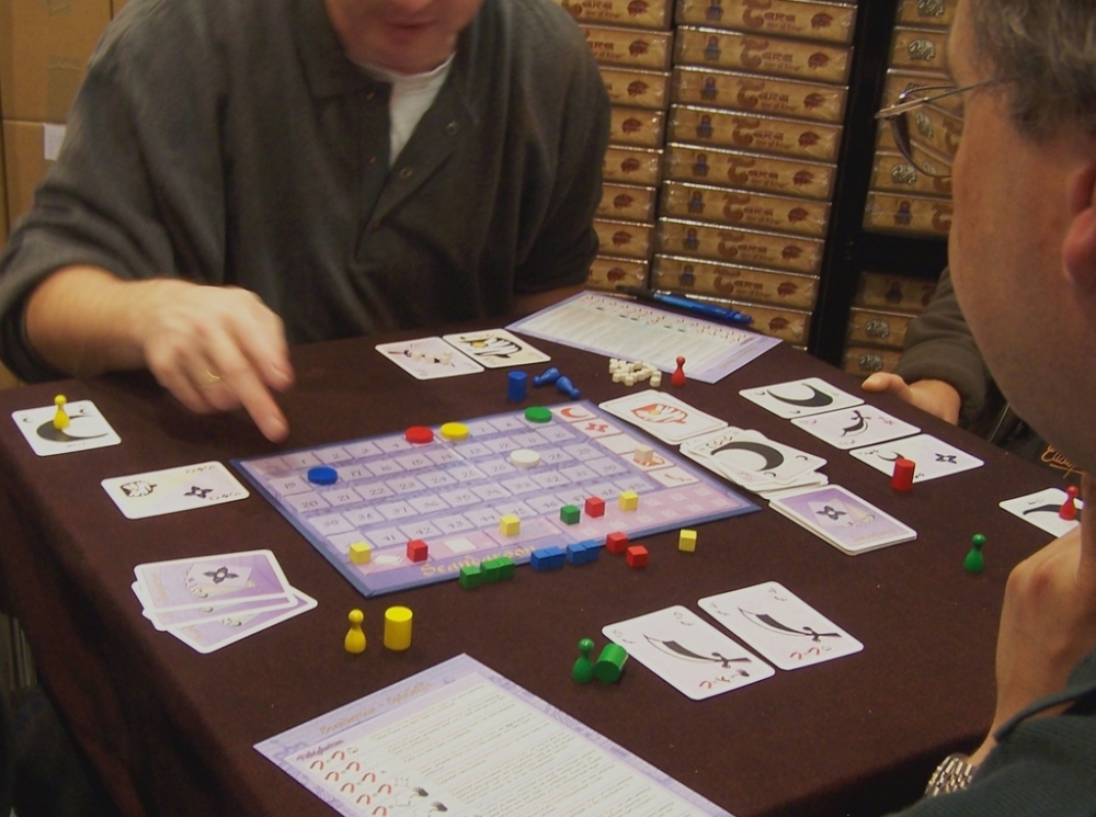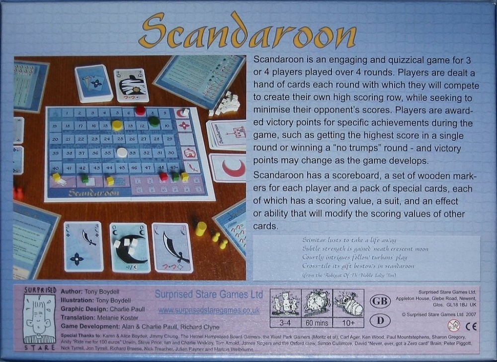 Scandaroon é um jogo de cartas envolvente e interrogativo para 3 ou 4 jogadores jogado ao longo de quatro rodadas. Os jogadores recebem uma mão de cartas cada rodada, com o qual eles irão competir para criar sua própria linha de pontuação, procurando ao mesmo tempo minimizar a pontuação de seus oponentes.