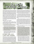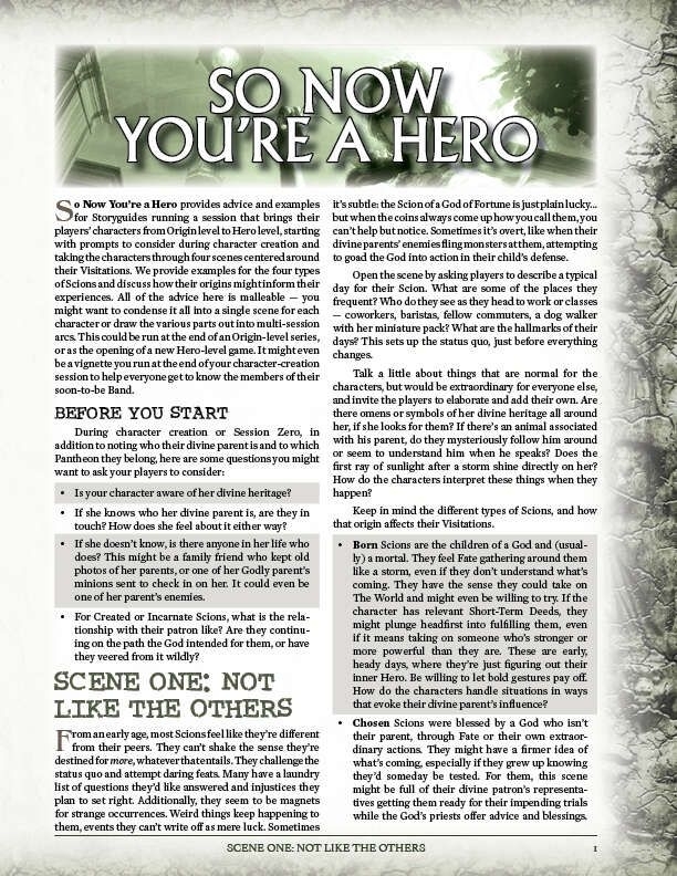 So Now You're a Hero fornece conselhos e exemplos para Storyguides que conduzem uma sessão que leva os personagens de seus jogadores do nível de Origem ao nível de Herói, começando com instruções a serem consideradas durante a criação do personagem e levando os personagens por quatro cenas centradas em suas Visitas.