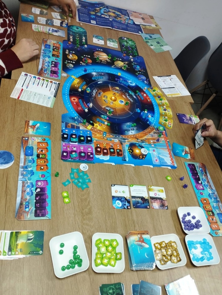 Você também usará mais de 200 cartas para auxiliar seus esforços ou concentrar sua pesquisa em uma direção específica para obter bônus e recompensas adicionais. Cada carta tem efeitos e ilustrações exclusivos e retrata tecnologias, projetos e descobertas da vida real (como a ISS, o Grande Colisor de Hádrons, o rover Perseverance, a sonda Voyager e muito mais).