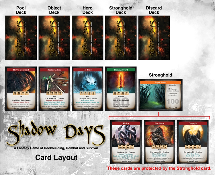 Shadow Days é um jogo de cartas customizável, com combate e sobrevivência, com o tema de fantasia, da Black Tea Studios. É fácil de aprender, simples de configurar, e mais importante, se divertir. Batalhe com seu oponente usando criaturas e objetos poderosos, enquanto lida com eventos fatais. Ganhe ouro para comprar poderosos heróis e fortalezas de proteção. Precisará de músculos, cérebro, ouro, e um pouco de sorte para sobreviver! Shadow Days é indispensável para qualquer jogador que goste de fantasia.
