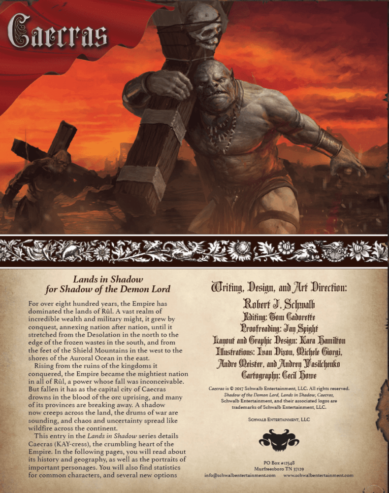 Esta entrada na série Lands in Shadow detalha Caecras (KAY-cress), o coração em ruínas do Império. Nas páginas seguintes, você lerá sobre sua história e geografia, bem como os retratos de personagens importantes. Você também encontrará estatísticas para personagens comuns e várias novas opções para personagens de jogadores. Com Caecras, você tem tudo o que precisa para explorar a capital em ruínas e torná-la a peça central de sua campanha Shadow of the Demon Lord.