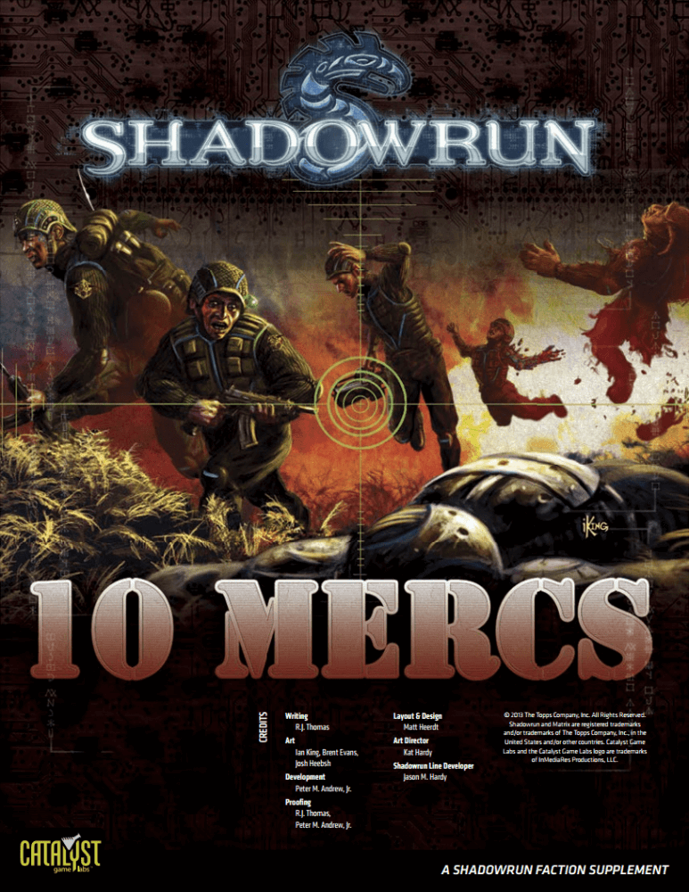 Juntamente com os perfis das unidades, 10 Mercs fornecem estatísticas de NPC para cada unidade, juntamente com informações sobre os veículos usados ​​por muitas das unidades. Se os mercenários vão desempenhar um papel em sua campanha, 10 Mercs é um recurso crítico para adicionar sabor, ganchos de enredo e regras ao seu jogo Shadowrun.