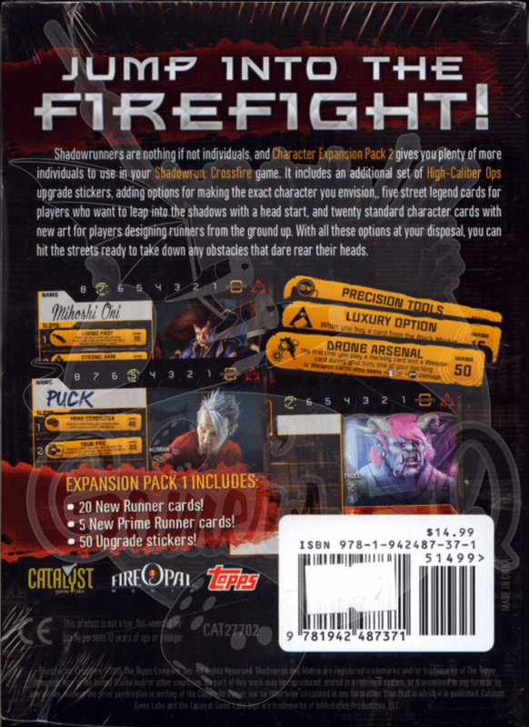 Shadowrunners nada mais são do que indivíduos e Character Expansion Pack 2 traz vários para você usar no seu Shadowrun: Crossfire. Inclui um novo conjunto de adesivos de melhoria, acrescentando opções para que você construa o personagem que deseja, cinco cartas de "lendas das ruas" para jogadores que querem mergulhar nas sombras com alguma vantagem, e 20 cartas padrões de personagens com artes alternativas para que os jogadores criem um novo runner do seu jeito. Parta para as ruas pronto para derrubar qualquer obstáculo que cruzar seu caminho.