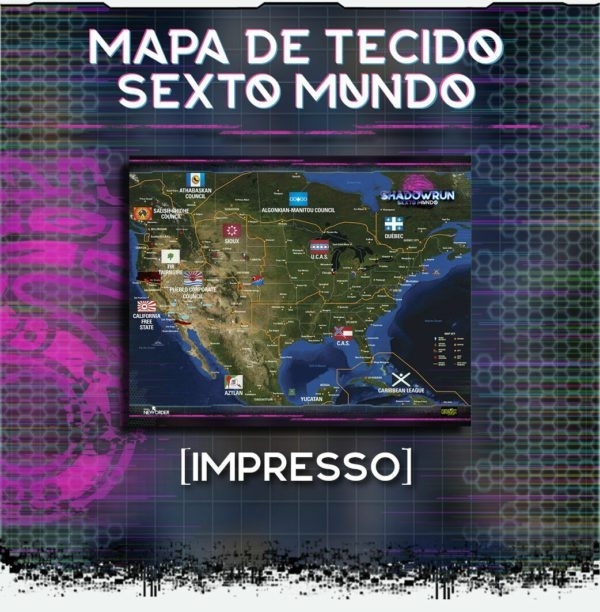 Mapa em tecido colorido medindo 60 x 90 cm com ilustração de Shadowrun 6a Edição!