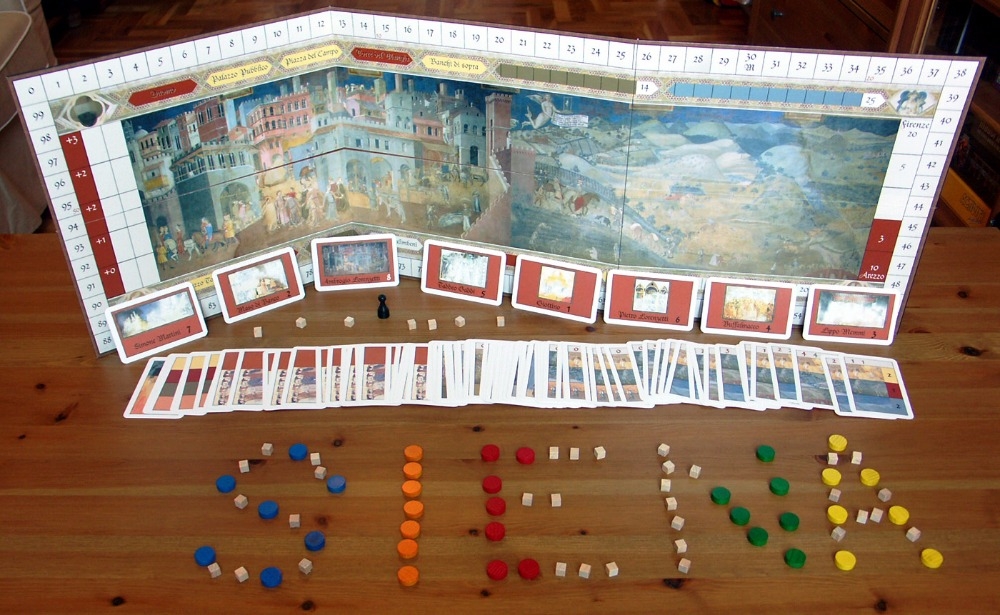 Você vai começar como Camponês, semeando o solo e vendendo sua colheita ao longo da Via Francigena. Se você economizar Florins o suficiente, você poderá atingir uma situação mais confortável, comercializando pano e especiarias em toda a Toscana. Mas o seu sonho é maior: entrar no Conselho dos Nove, o governo da cidade. Para tanto você vai ter que se transformar em Banqueiro, e usar seu dinheiro para obter o consentimento do Senesi: você irá financiar os artistas da época ou contribuir para a construção da nova Torre del Mangia? Seja cuidadoso, os florins que você economizou poderão não ser suficiente! Atrás de cada canto da vila escondem-se as armadilhas dos outros jogadores: pedintes, ladrões, bonitas mulheres de dentro da taverna...
