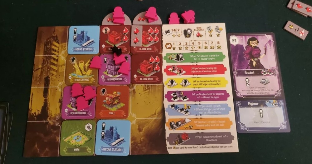 O jogo termina após 8 rodadas, quando a grade da cidade de todos estiver cheia. Você ganhará pontos por ter cada um dos 7 tipos de construção, uma ampla rede de bancos de sangue e moradia adequada para os vampiros meeples que seus especialistas trazem para a cidade. Os vampiros também querem garantir que todo esse avanço tecnológico não destrua a biodiversidade de sua casa, então você ganhará pontos por ter uma variedade de animais e meeples de animais em suas peças.