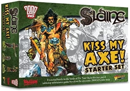Sláine: Beije meu machado! é um jogo de batalha de miniaturas de mesa para dois ou mais jogadores ambientado no mundo de fantasia criado pelos lendários criadores de quadrinhos Pat Mills e Angela Kincaid. Machados e espadas se chocam enquanto a magia da Terra e do Sour atacam a Terra dos Jovens, enquanto as Tribos da Terra da deusa Danu lutam contra os decadentes Drune Lords e os implacáveis Fomorian Sea Demons.
