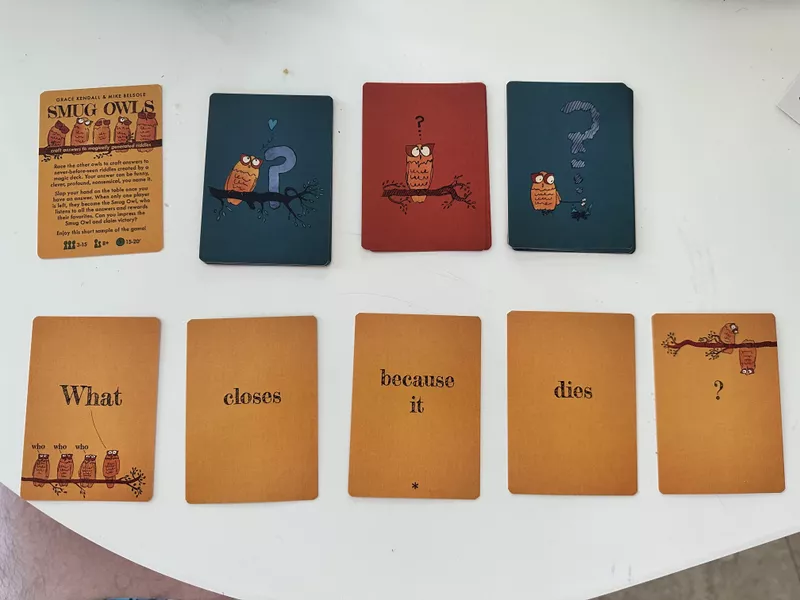 Em Smug Owls, corra para criar respostas para charadas nunca antes vistas, criadas por um baralho mágico. Sua resposta pode ser qualquer coisa—engraçada, cheia de trocadilhos, inteligente, profunda, sem sentido, você escolhe. Bata a mão na mesa assim que estiver pronto. Quando apenas um jogador restar, ele se torna a Coruja Satisfeita, que escuta todas as respostas e recompensa a sua favorita.