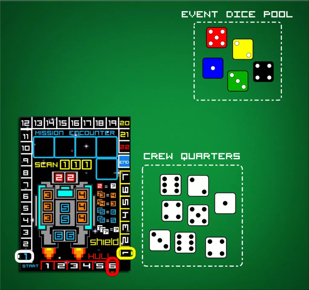 SPACE TREK - A 1-Card Mission é um jogo de aventura espacial para um jogador "influenciado por Star Trek - The Dice Game", onde você é responsável pelo retorno seguro de sua tripulação e envia o "Explorer" para a base estelar 259. Depois de se separar da frota de batalha durante um grande encontro, você se encontra profundamente na zona neutra. Enquanto você tenta voltar para a base Star, sua nave estará viajando por zonas inimigas e campos de asteroides. Sua missão é levar sua nave estelar de volta à zona segura e à base estelar 259 no turno 21. Se você perder muitos tripulantes devido ao dano excessivo de sua nave estelar, você perde o jogo.