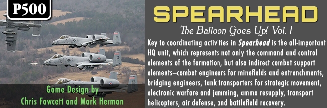 O jogo fornece aos jogadores ordens de batalha precisas para os participantes até o nível de batalhão (com base nos níveis de força de 1986) - o US V Corps, o III Korps da Alemanha Ocidental, o 1º Exército Francês, o 8º Exército Soviético e o 1º Exército de Tanques de Guarda e o Exército da Alemanha Oriental. 3º Exército. Spearhead é baseado no sistema Flashpoint: Golan de Mark Herman , que foi atualizado e refinado. O jogo usa um sistema de ativação chit-pull, com as divisões sendo as formações primárias. A escala do jogo é de 4 km por hex, os turnos são de 1 dia (impulsos de ativação de 12 horas).