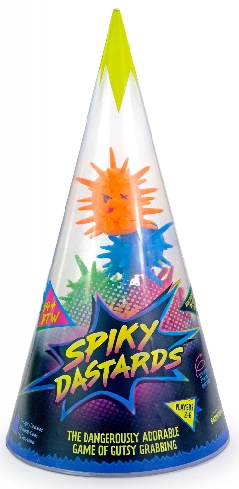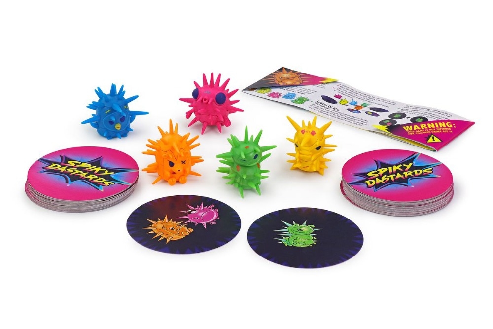 Spiky Dastards tem 5 figuras pequenas que são tão fofas que você vai querer capturar todas elas. Mas tenha cuidado, elas estão bem protegidas! Divida o baralho de 60 cartas em 2 pilhas e revele a carta de cima de cada uma. As imagens nas cartas indicarão 1 ou 2 das figuras que os jogadores devem correr para agarrar com cuidado. Se você é capaz de pegar um, você recebe um cartão. Se você pegar o errado, você perde um cartão. Você terá que ser ousado se quiser ganhar mais cartas e vencer!