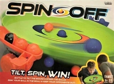 Spin Off é um jogo para 2 jogadores que gira em torno da gravidade. Os jogadores manipulam controles mecânicos para inclinar o tabuleiro côncavo em uma batalha para guiar e desviar as bolas em jogo. Cada jogador usa movimentos ofensivos e defensivos para inclinar e rolar suas próprias bolas para o gol central, mantendo as bolas do adversário fora. O primeiro a colocar todas as cinco bolas no gol vence.