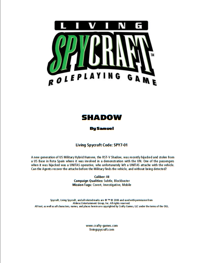 Uma nova geração de Humvee Híbrido Militar dos EUA, o RST-V Shadow, foi recentemente sequestrada e roubada de uma base americana em Rota Espanha, onde estava envolvida em uma manifestação com a ONU. Um dos passageiros do sequestro era um agente da UNITAS, que infelizmente deixou um adido da UNITAS com o veículo. Os Agentes podem recuperar o adido antes que os Militares encontrem o veículo, e sem serem detectados?