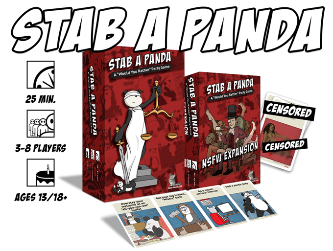 Stab a Panda é um jogo de festa no estilo “você prefere” para 3 a 8 jogadores que dura 25 minutos. Apresenta um humor um tanto atrevido que inclui, em vez de atacar, grupos marginalizados.