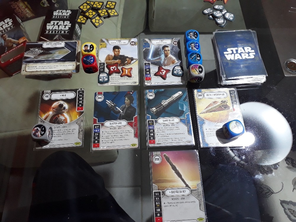 Star Wars: Destiny é composto por dois conjuntos iniciais - Rey e Kylo Ren, cada um com nove dados e 24 cartas - e os boosters Awakenings, cada um contendo um dado e cinco cartas.